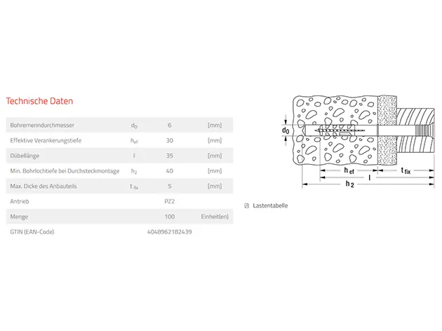 - Das breite Sortiment an Durchmessern und Nutzlängen bietet den richtigen Dübel für jede Befestigung.