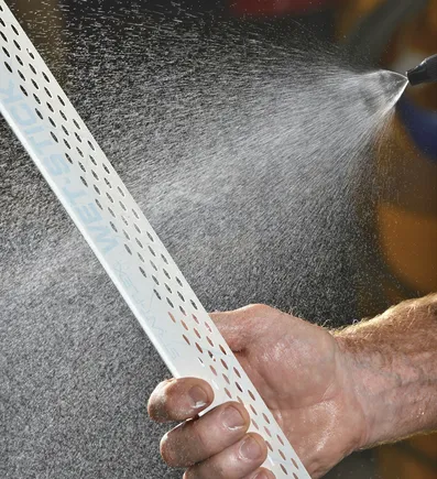 Die blaue Klebeseite des Kantenprofils wird durch Besprühen mit Wasser aktiviert. Profil bis zum Profilkopf anspachteln. Bitte Verarbeitungshinweise in den Technischen Merkblättern beachten!